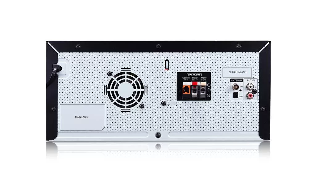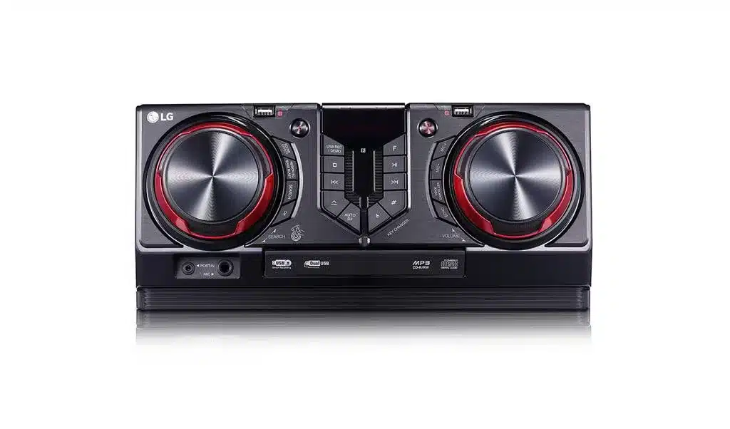 LG CJ45. Type: Home audio mini system, Product colour: Black, Red, Number of optical discs: 1 discs. Impedance: 3 Ω, Peak Music Power Output (PMPO): 720 W, Subwoofer type: Active subwoofer. Supported radio bands: FM, Tuner type: Digital, FM band range: 87.5 – 108 MHz. Playback disc formats: CD audio. Power source: AC, Power consumption (standby): 0.5 W, Battery type: AAA