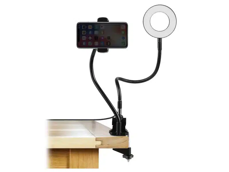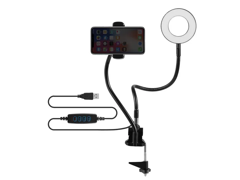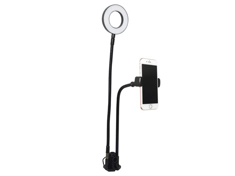Metal arm, desk clamp, and phone holder with a 9cm ring light.